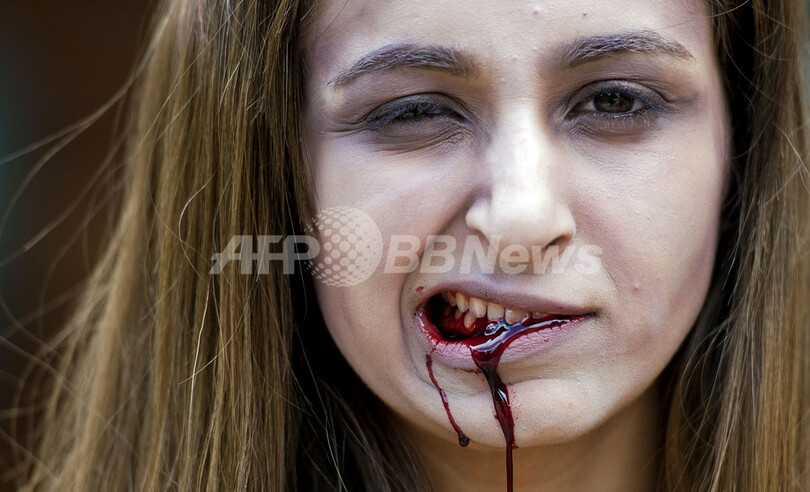 写真は、訓練のためゾンビに扮した女性(2013年8月18日撮影)。(c)AFP/WILL OLIVER