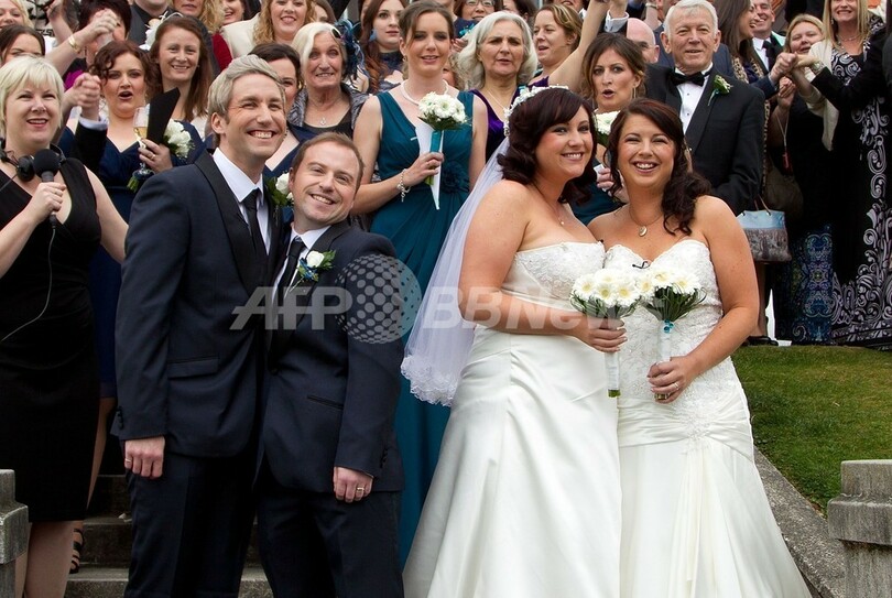 写真は、ニュージーランド・ロトルア(Rotorua)のロトルア博物館(Rotorua Museum)で結婚式を挙げた2組の同性婚カップル(2013年8月19日撮影)。(c)AFP/MARTY MELVILLE