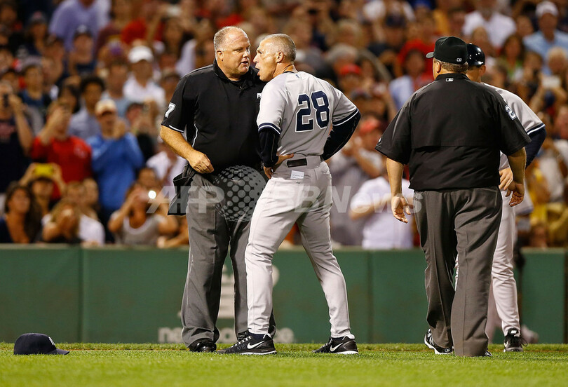 ブライアン・オノラ(Brian O'Nora)主審(左)に詰め寄るニューヨーク・ヤンキースのジョー・ジラルディ(Joe Girardi)監督(2013年8月18日撮影)。(c)AFP/Getty Images/Jared Wickerham