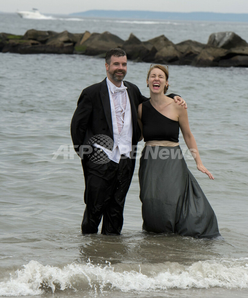 写真は、正装姿で海に漬かりながら、カメラに向かってポーズするカップル(2013年8月18日撮影)。(c)AFP/Don Emmert