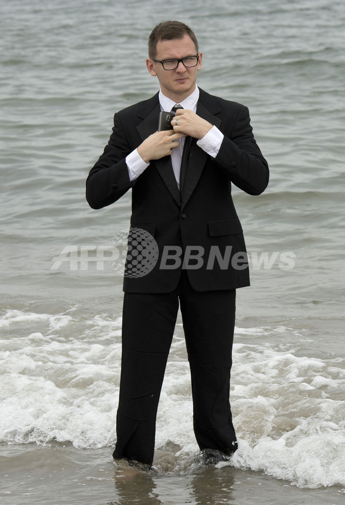 写真は、正装姿で海に漬かりながら、ネクタイを締め直す男性(2013年8月18日撮影)。(c)AFP/Don Emmert