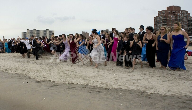 【8月20日 AFP】米ニューヨーク(New York)州コニーアイランド(Coney Island)で18日、奇抜なパフォーマンスを繰り広げるコメディー集団「ImprovEverywhere」が、正装で海辺に繰り出すイベント「ブラックタイ・ビーチ(Black Tie Beach)」を開催した。イベントでは、正装姿で集まった大勢の男女や子どもが、びしょ濡れになりながら海辺を走り回る姿が見られた。(c)AFP