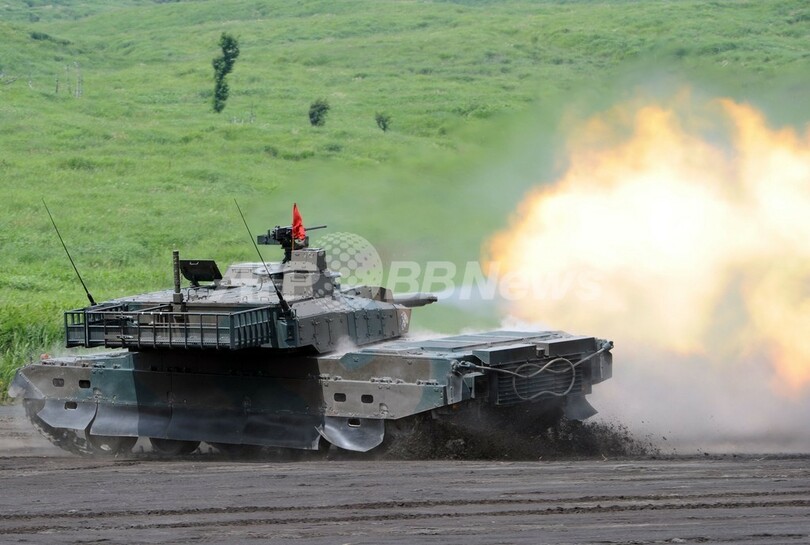 写真は、予行演習中に方向転換しながら射撃する10式戦車(2013年8月20日撮影)。(c)AFP/TOSHIFUMI KITAMURA