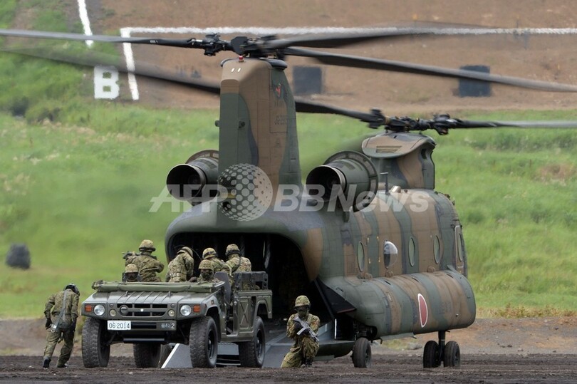 写真は、予行演習中のCH-47J輸送ヘリコプターから降ろされた車両(2013年8月20日撮影)。(c)AFP/TOSHIFUMI KITAMURA