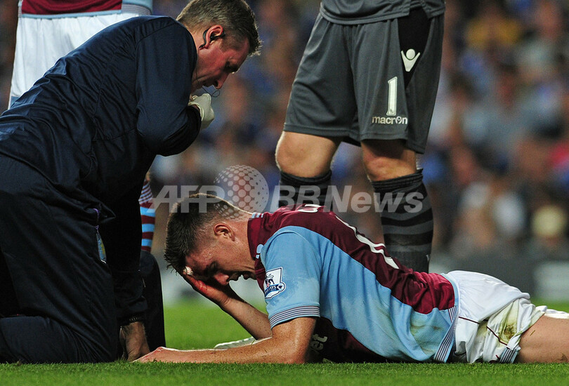 頭部を負傷し、治療を受けるアストン・ビラのキアラン・クラーク(Ciaran Clark、2013年8月21日撮影)。(c)AFP/CARL COURT