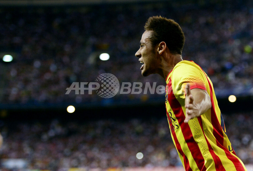後半20分に同点ゴールを挙げ歓喜するFCバルセロナのネイマール(Neymar da Silva Santos Junior、2013年8月21日撮影)。(c)AFP/JAVIER SORIANO