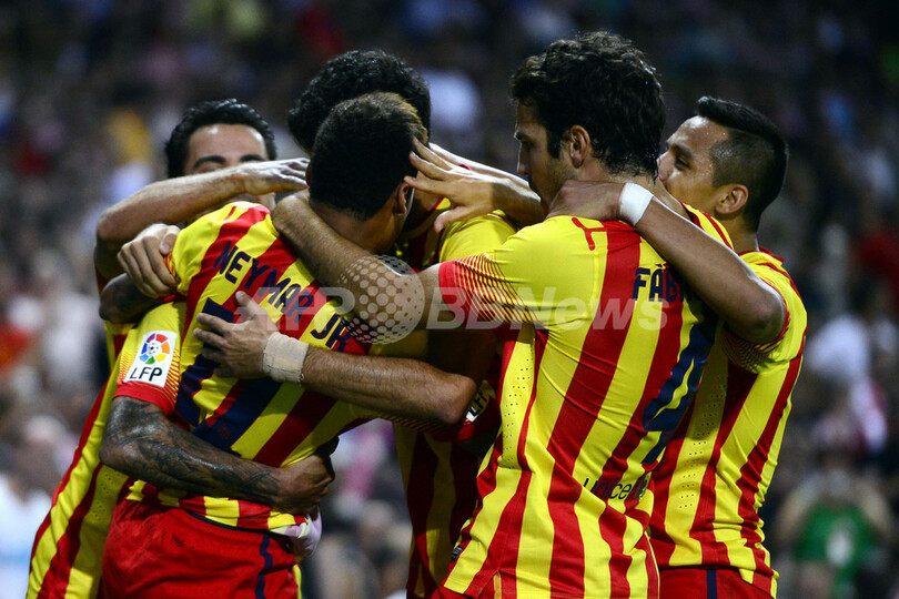 ネイマール(Neymar da Silva Santos Junior)が決めた同点ゴールを喜ぶFCバルセロナの選手(2013年8月21日撮影)。(c)AFP/JAVIER SORIANO