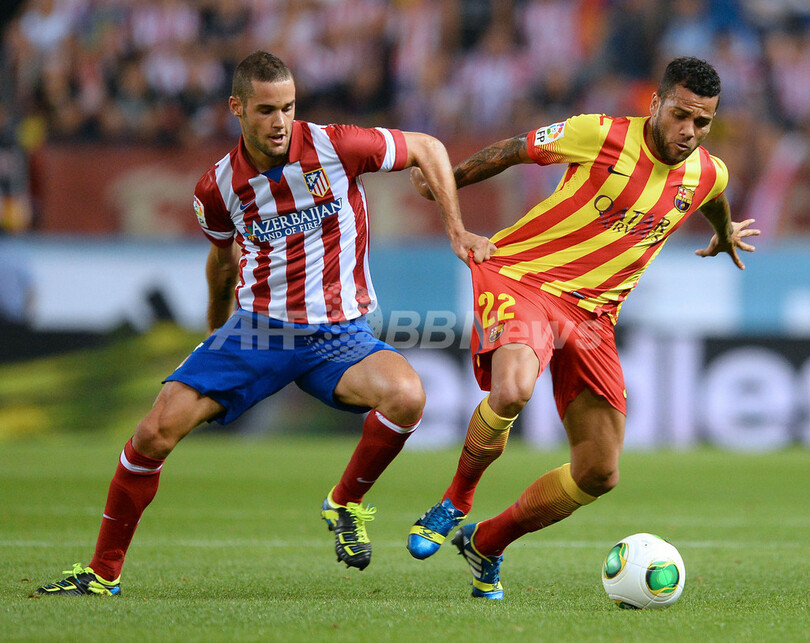 ボールを競るFCバルセロナのダニエル・アルヴェス(Daniel Alves、右)とアトレティコ・マドリードのマリオ・スアレス(Mario Suarez、2013年8月21日撮影)。(c)AFP/GERARD JULIEN