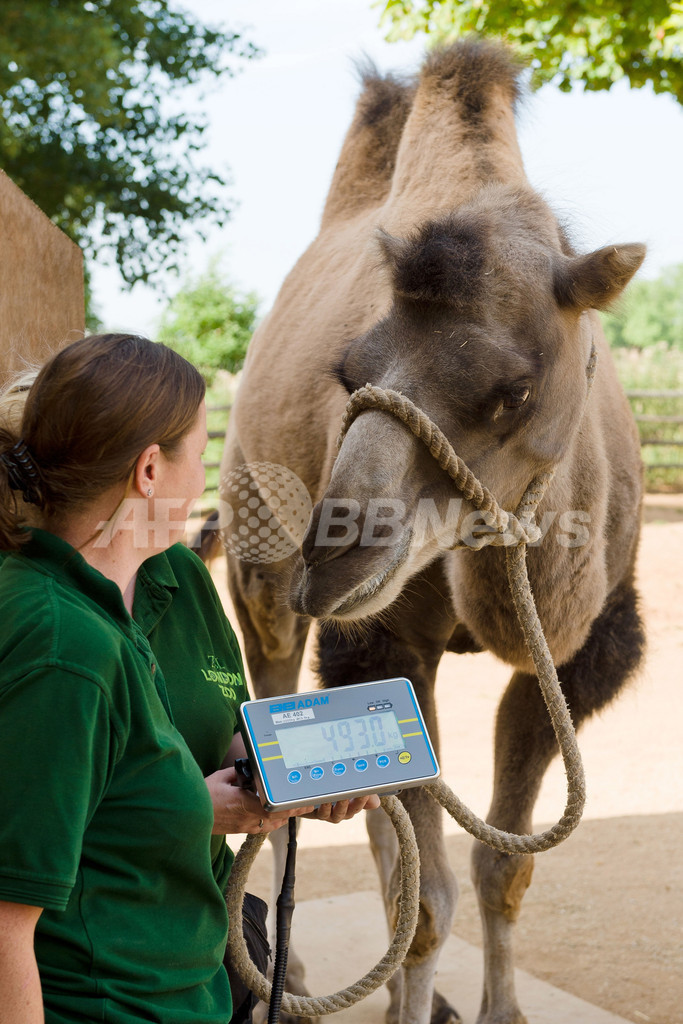 写真は、計量器に載せられたフタコブラクダのジンギス(Ghenghis)君(2013年8月21日撮影)。(c)AFP/Leon Neal