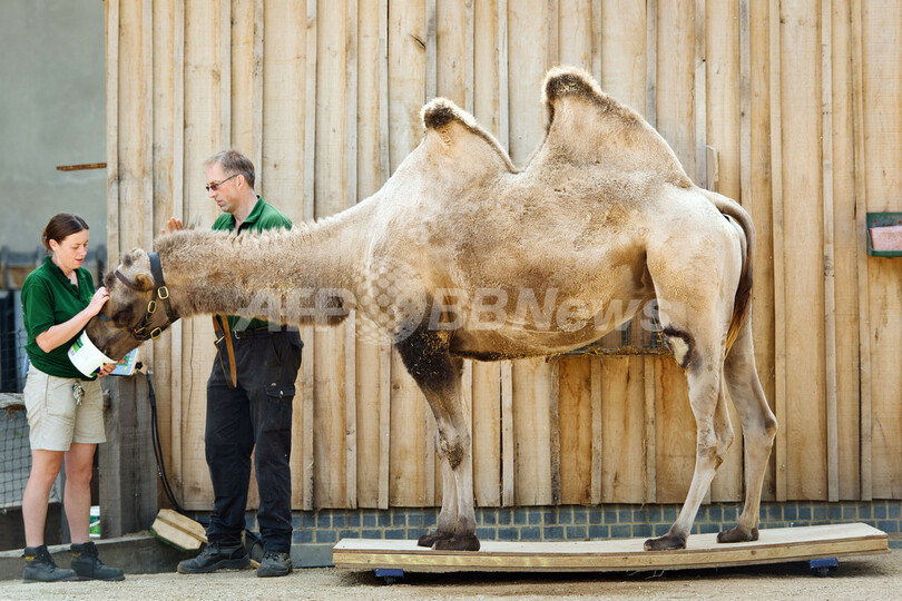 写真は、計量器に載せられたフタコブラクダのノエミ(Noemie)ちゃん(2013年8月21日撮影)。(c)AFP/Leon Neal