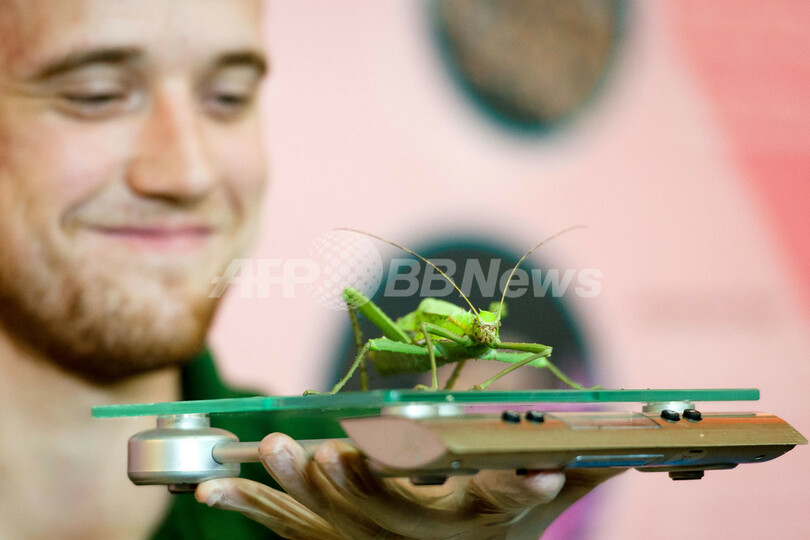 写真は、計量器に載せられたサカダチコノハナナフシ(2013年8月21日撮影)。(c)AFP/Leon Neal