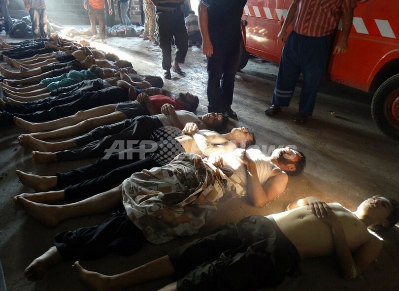 シリアの反体制派は、21日の政府軍の攻撃による死者は1300人以上だと述べている。人権活動家らが公開した動画などには、口から泡を吹く人や、呼吸困難に陥った被害者に酸素吸入しているとみられる医師、意識不明状態の子どもたちに蘇生を試みる医師などの姿が写っている。化学兵器や防衛の専門家らは、これらはサリンやVXガスといった神経ガスにさらされた際の症状と一致すると述べている。