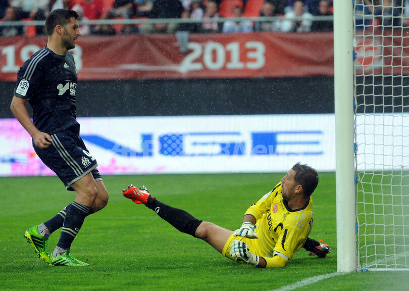 バランシエンヌのGKニコラス・プヌトー(Nicolas Penneteau、右)から得点を奪うオリンピック・マルセイユのアンドレ・ピエール・ジニャック(Andre-Pierre Gignac、2013年8月24日撮影)。(c)AFP/FRANCOIS LO PRESTI