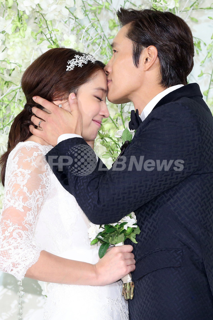韓国・ソウル(Seoul)のグランドハイアットホテル(Grand Hyatt Seoul Hotel)で10日、俳優のイ・ビョンホン(Lee Byung-hun)と女優のイ・ミンジョン(Lee Min-Jung)との結婚式が行われた。写真は、フォトセッションに登場した俳優のイ・ビョンホンと女優のイ・ミンジョン(2013年8月10日撮影)。(c)STARNEWS