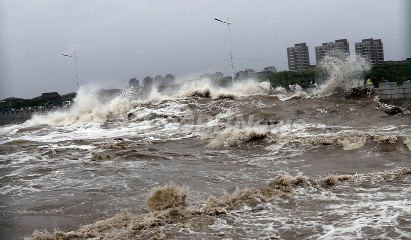 【8月25日 AFP】中国の浙江(Zhejiang)省海寧(Haining)市で22日、河口から川の水が逆流する毎年恒例の現象「海寧潮」による高波が堤防を越え、岸辺に集まっていた見物客らが押し流された。