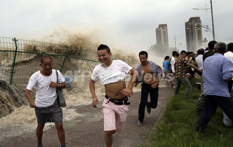 写真は浙江省海寧市で海寧潮から逃げる見物客ら(2013年8月22日撮影)。(c)AFP