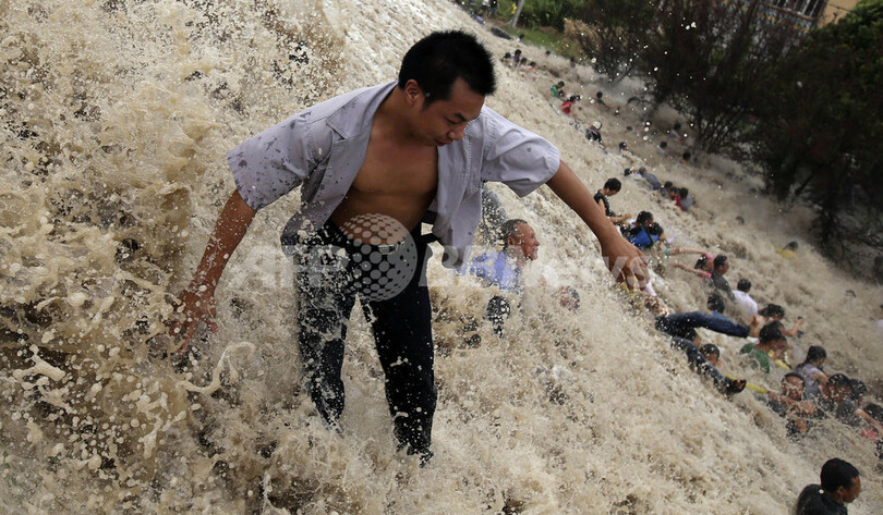 【8月25日 AFP】中国の浙江(Zhejiang)省海寧(Haining)市で22日、河口から川の水が逆流する毎年恒例の現象「海寧潮」による高波が堤防を越え、岸辺に集まっていた見物客らが押し流された。