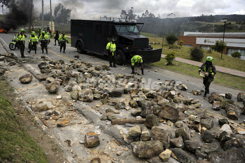 デモ参加者らが国内の数十か所で道路を封鎖し、貨物トラックなどの通行を妨害しているため首都ボゴタ(Bogota)では一部の食品が不足。価格が上昇している。また、23日にはバイクに乗っていた男性が路上のバリケードに激突、死亡する事故も発生した。(c)AFP