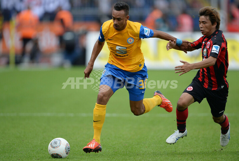 アイントラハト・ブラウンシュバイクのカリム・ベララビ(Karim Bellarabi、左)とボールを競るフランクフルトの乾貴士(Takashi Inui、2013年8月25日撮影)。(c)AFP/DPA/PETER STEFFEN