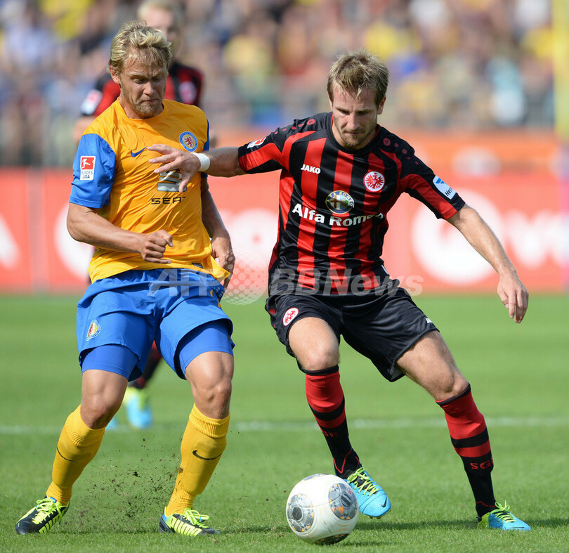 アイントラハト・ブラウンシュバイクのヤン・ホッホシャイト、左)とボールを競るフランクフルトのシュテファン・アイグナー(Stefan Aigner、2013年8月25日撮影)。(c)AFP/DPA/PETER STEFFEN