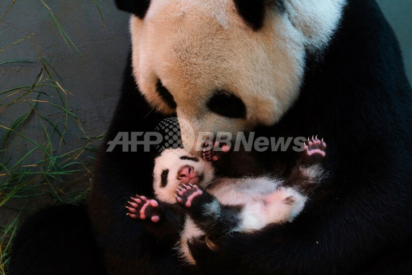ママに抱かれご満悦、台湾の赤ちゃんパンダ