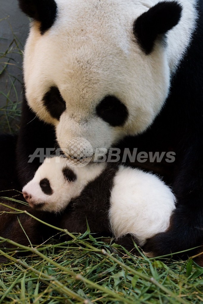 ママに抱かれご満悦、台湾の赤ちゃんパンダ