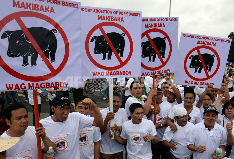 写真は、国会議員に割り当てられる優先開発支援資金(PDAF)が、汚職の温床とされる「ポークバレル」 であると非難するプラカードを掲げてマニラ中心部の公園で開かれた反汚職集会に参加した人たち(2013年8月26日撮影)。(c)AFP/TED ALJIBE