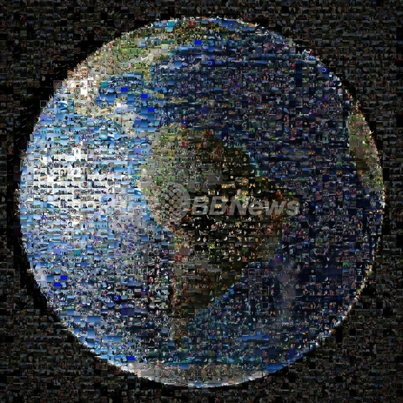 イベントは7月19日、カッシーニが地球を撮影するタイミングに合わせて土星に向かって手を振ることを呼び掛けるもの。これに応え、ツイッター(Twitter)やフェイスブック(Facebook)などを通じて、米30州および世界40か国の人たちから、手を振る画像が1400枚以上寄せられた。コラージュは地球の画像をベースに作成された。(c)AFP