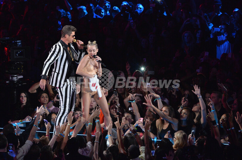 ディズニー番組「シークレット・アイドル ハンナ・モンタナ(Hannah Montana)」の子役として有名になり、現在20歳のサイラスは、授賞式でロビン・シック(Robin Thicke)とともにシックの曲「ブラード・ラインズ~今夜はヘイ・ヘイ・ヘイ♪(Blurred Lines)」を披露した。