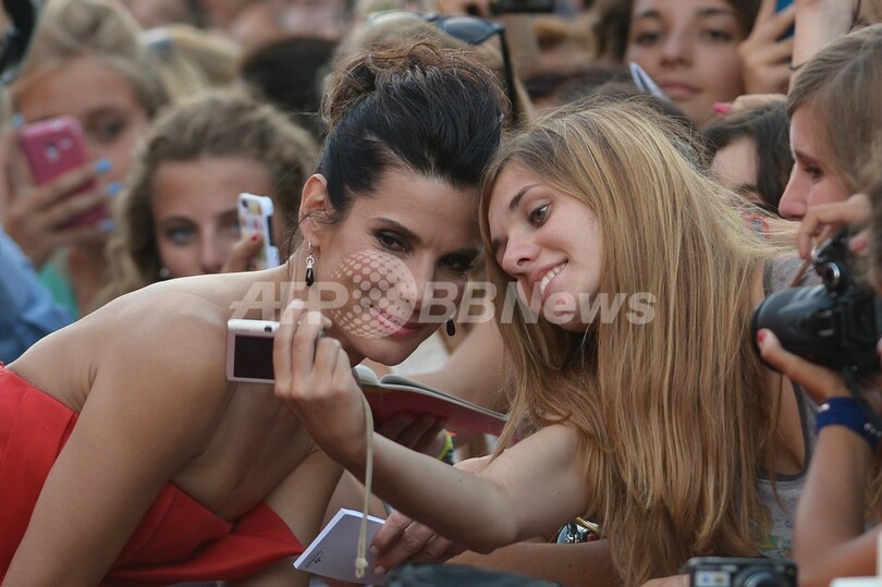 写真は、オープニングのレッドカーペットでファンと写真を撮るブロック(2013年8月28日撮影)。(c)AFP/GABRIEL BOUYS