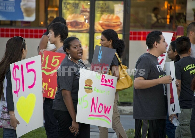 【8月30日 AFP】マクドナルド(McDonald's)をはじめとするファストフードチェーン大手の従業員数千人が29日、全米各地で最低賃金の引き上げを要求するストを行った。主催者側は、2000億ドル(約19兆6000億円)の市場規模を持つ米ファストフード業界で行われた「過去最大規模のスト」としている。