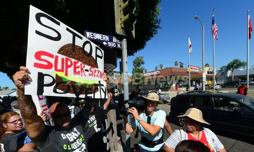 【8月30日 AFP】マクドナルド(McDonald's)をはじめとするファストフードチェーン大手の従業員数千人が29日、全米各地で最低賃金の引き上げを要求するストを行った。主催者側は、2000億ドル(約19兆6000億円)の市場規模を持つ米ファストフード業界で行われた「過去最大規模のスト」としている。
