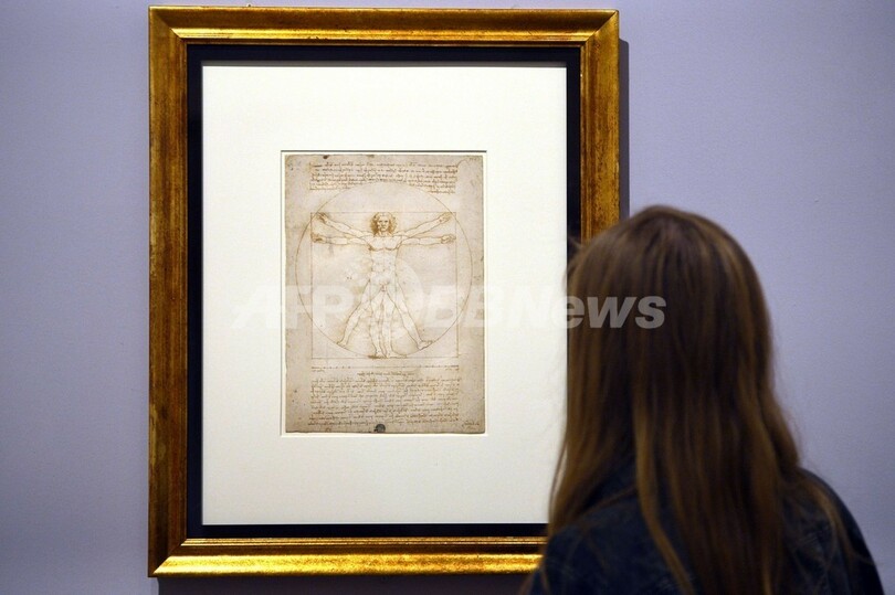 写真は同展覧会で、ダビンチの「ウィトルウィウス的人体図(Vitruvian Man)」を見る人(2013年8月29日撮影)。(c)AFP/GABRIEL BOUYS