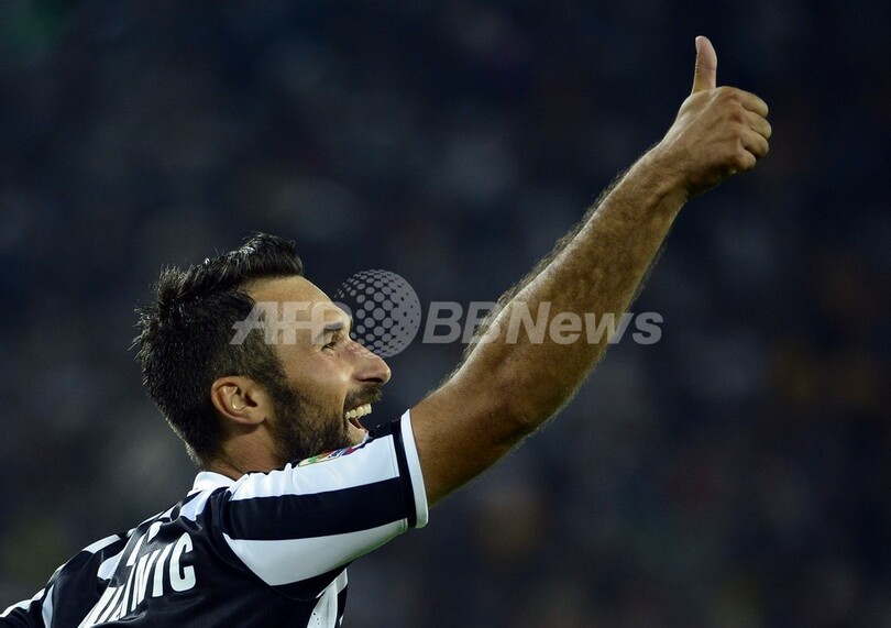 得点を決め喜ぶユベントスのミルコ・ブチニッチ(Mirko Vucinic、2013年8月31日撮影)。(c)AFP/OLIVIER MORIN