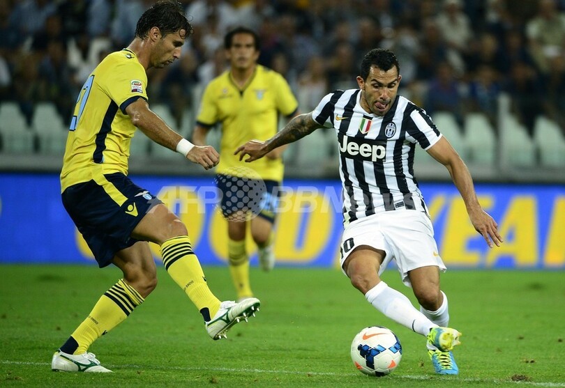 キエーボのロリク・カナ(Lorik Cana)をかわすユベントスのカルロス・テベス(Carlos Tevez、2013年8月31日撮影)。(c)AFP/OLIVIER MORIN