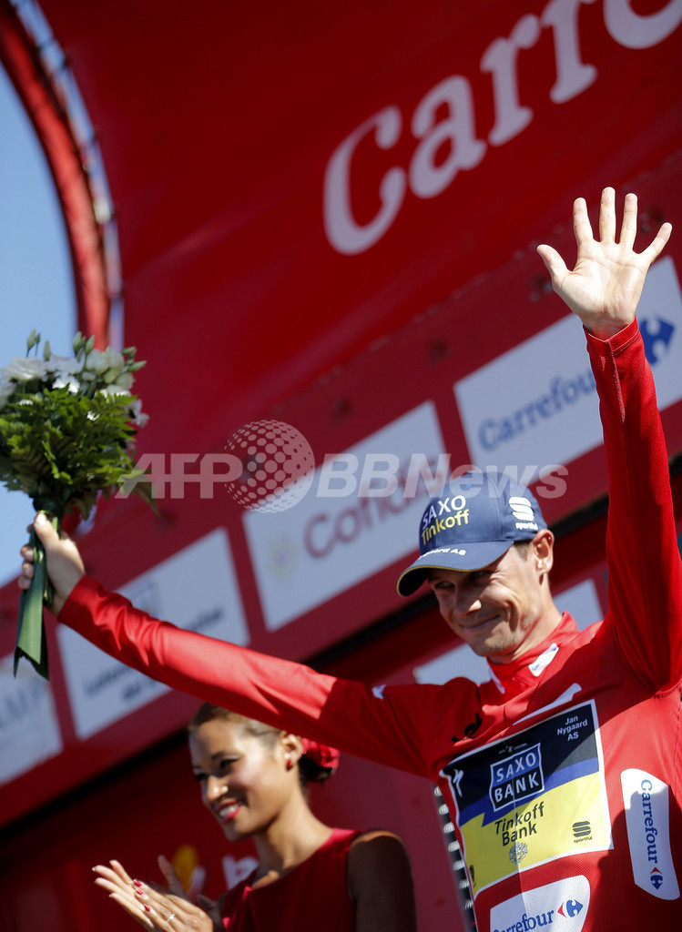 表彰台で喜ぶチーム・サクソ・ティンコフ(Team Saxo-Tinkoff)のニコラス・ロッシュ(Nicolas Roche、2013年8月31日撮影)。(c)AFP/JOSE JORDAN