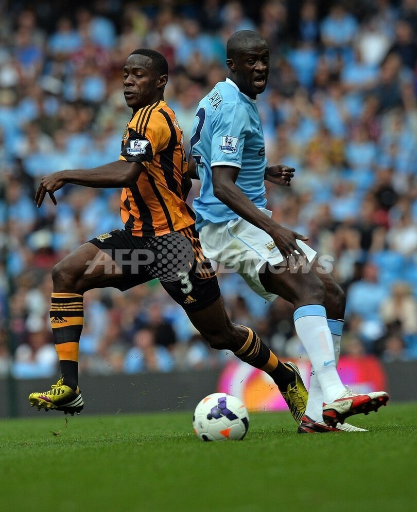 ボールを競るハル・シティのマイノル・フィゲロア(Maynor Figueroa、左)とマンチェスター・シティのヤヤ・トゥーレ(Yaya Toure、2013年8月31日撮影)。(c)AFP/PAUL ELLIS