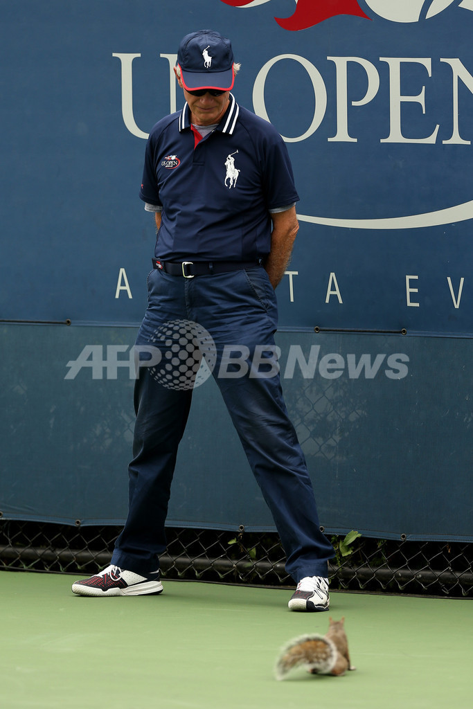 コートに迷い込んだリスを見つめるラインアンパイア(2013年8月31日撮影)。(c)AFP/Getty Images/Matthew Stockman