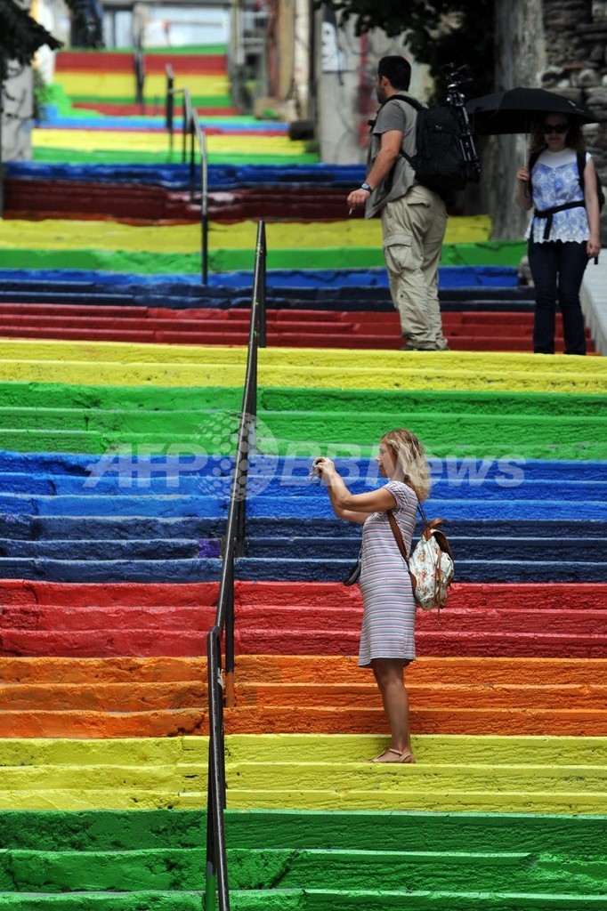 ニュース ライフ 虹色の階段を上ろう!トルコ・イスタンブール 2013年9月1日 9:19 発信地:イスタンブール/トルコ [ 中東・北アフリカ トルコ ] このニュースをシェア ‹ › ❮ 7/8 ❯ トルコ・イスタンブール(Istanbul)のベイオール(Beyoglu)にあるジハンゲル(Cihangir)地区の虹色に塗られた階段。この階段は、先月27日に地元の男性が虹色に塗ったことで注目を集めた。ベイオール当局が29日夜にグレーに塗り直したところソーシャルメディアで批判的なコメントが相次ぎ、多くの人たちの手によって再び虹色に塗り直された。写真は、階段の写真を撮る女性(2013年8月31日撮影)。(c)AFP/OZAN KOSE 画像作成中 ! 【9月1日 AFP】トルコ・イスタンブール(Istanbul)のベイオール(Beyoglu)にあるジハンゲル(Cihangir)地区の虹色に塗られた階段。 この階段は、先月27日に地元の男性が虹色に塗ったことで注目を集めた。ベイオール当局が29日夜にグレーに塗り直したところソーシャルメディアで批判的なコメントが相次ぎ、多くの人たちの手によって再び虹色に塗り直された。(c)AFP ライフ 一覧へ> メディア・報道関係・法人の方向け 写真・動画 購入のお問合せ>