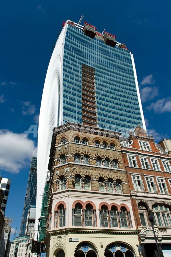 【9月1日 AFP】英ロンドン(London)中心部で「ウォーキートーキー(Walkie Talkie、トランシーバーの意)」と呼ばれる高層ビルが建設中だ。ガラス張りの外壁が凹面鏡のようにへこんだ独特のデザインのため、午後の早い時間帯には反射した日光が近隣の特定の場所に集中する。地元メディアによるとその場所の気温は周辺より高くなるという。(c)AFP