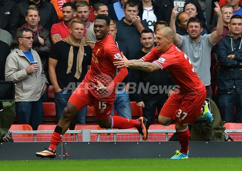 前半4分に先制ゴールを挙げ、マルティン・シュクルテル(Martin Skrtel、右)と喜ぶリバプールのダニエル・スターリッジ(Daniel Sturridge、2013年9月1日撮影)。(c)AFP/PAUL ELLIS