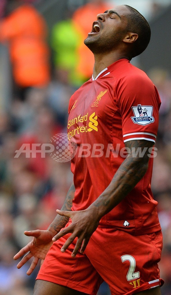 好機を逸し天を仰ぐリバプールのグレン・ジョンソン(Glen Johnson、2013年9月1日撮影)。(c)AFP/PAUL ELLIS