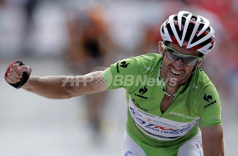 トップでフィニッシュラインを切り喜ぶダニエル・モレーノ(2013年9月1日撮影)。(c)AFP/JOSE JORDAN