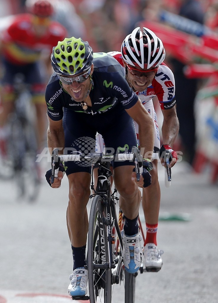 レースに臨むチーム・カチューシャのホアキン・ロドリゲス(Joaquim Rodriguez、奥)とアレハンドロ・バルベルデ(Alejandro Valverde、2013年9月1日撮影)。(c)AFP/JOSE JORDAN