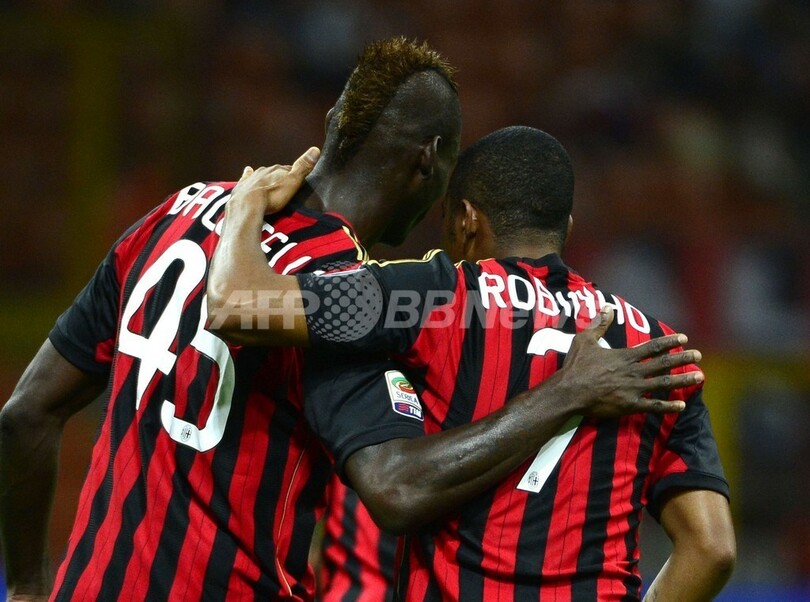 得点を喜ぶACミランのロビーニョ(Robinho、右)とマリオ・バロテッリ(Mario Barwauh Balotelli、2013年9月1日撮影)。(c)AFP/OLIVIER MORIN