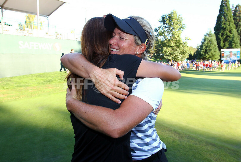 優勝を決め、最近現役を引退したソフィー・グスタフソン(Sophie Gustafson)氏(左)と抱擁を交わすスーザン・ペターセン(2013年9月1日撮影)。(c)AFP/Getty Images/Jonathan Ferrey