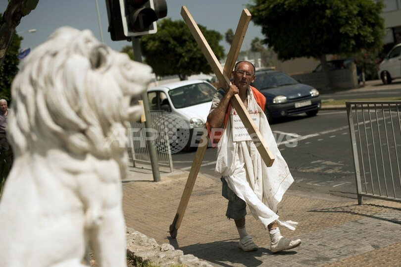 現在失業中のマルケスさんは、白いシーツをチュニックのようにまとい、「飢餓や戦争はもういらない。地球に平和を」と書かれたプラカードを首から下げてジブラルタルに現れた。ここで24時間の断食を行い、神に祈りをささげてからスペインに戻る予定だという。