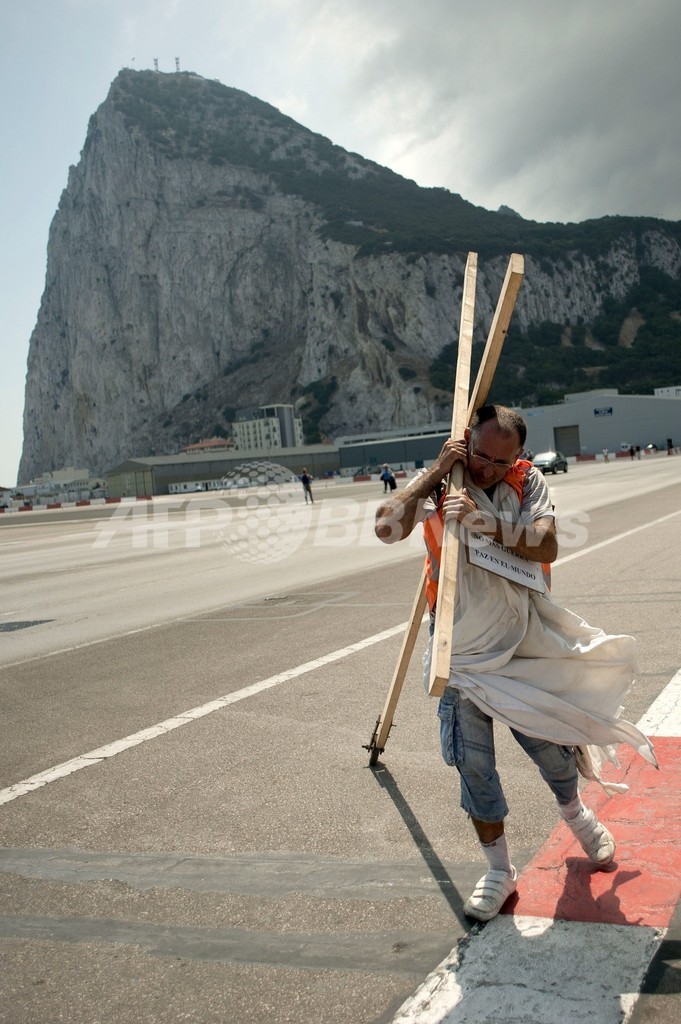 スペインとジブラルタルとの境界に位置する空港の滑走路を横断したフスト・マルケス(Justo Marquez)さん(50)が背負った十字架は、重さ約10キロ、高さ約3メートル、幅約2メートルで、最下部には車輪が取り付けてある。