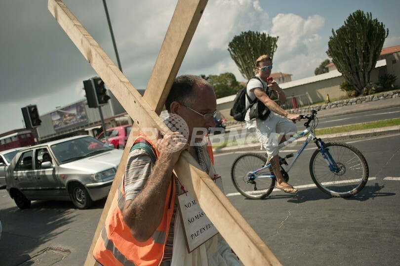 現在失業中のマルケスさんは、白いシーツをチュニックのようにまとい、「飢餓や戦争はもういらない。地球に平和を」と書かれたプラカードを首から下げてジブラルタルに現れた。ここで24時間の断食を行い、神に祈りをささげてからスペインに戻る予定だという。