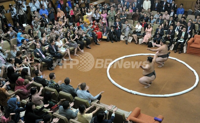 【9月5日 AFP】インドネシアの首都ジャカルタ(Jakarta)で、数千人の観衆が見つめる中、力士と力士の体がぶつかり合う音がスタジアム内に響き渡る。先月末、5年ぶりの海外巡業となる大相撲ジャカルタ巡業が開催された。